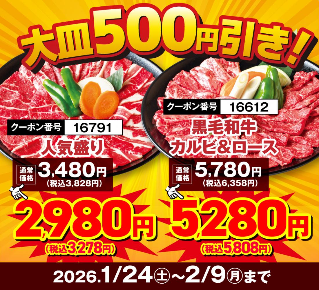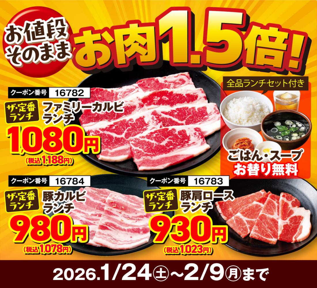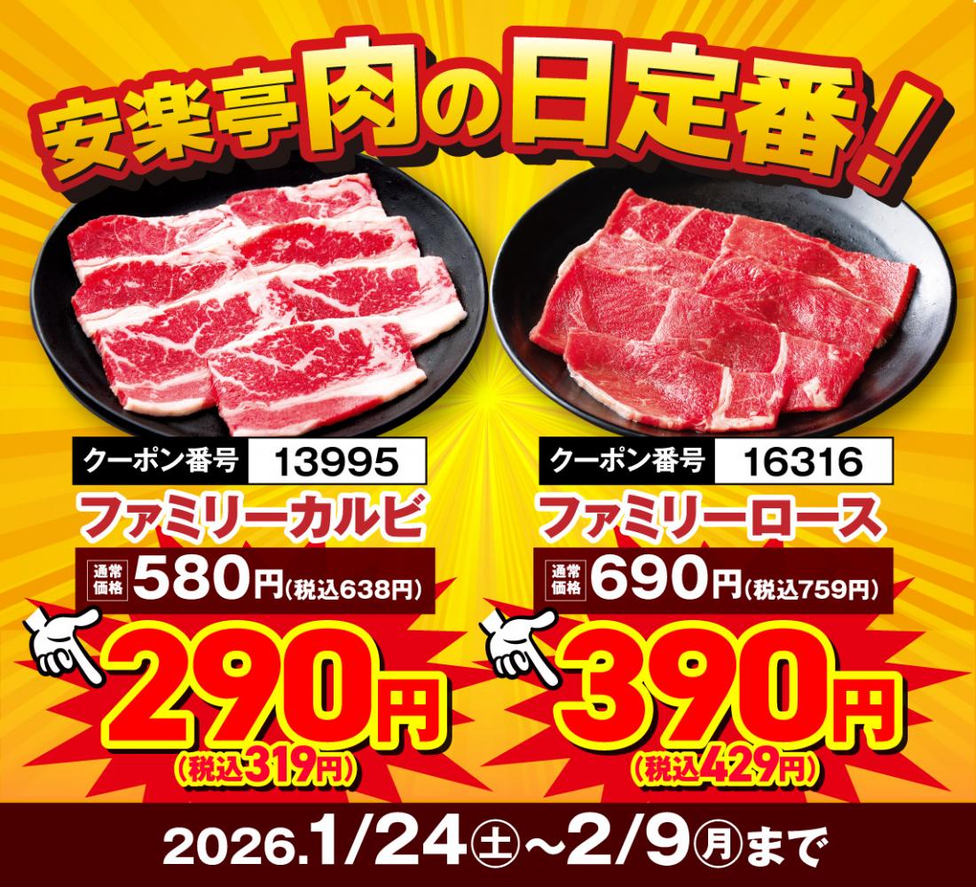 1月24日~スタート!【1月29日&2月9日は“W肉の日”】17日間の”肉の日リレーフェア”開催!【焼き肉レストラン 安楽亭 相模原上溝店】