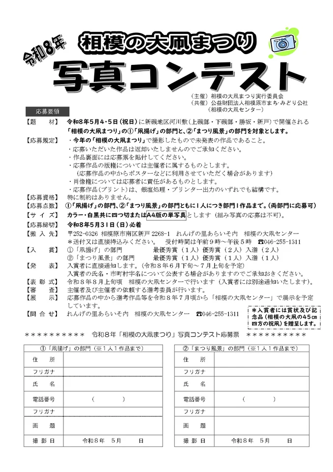 また、まつりの様子を撮影した写真を対象としたフォトコンテストも実施予定。入賞作品は2026年7月以降に「相模の大凧センター」で展示される予定です。